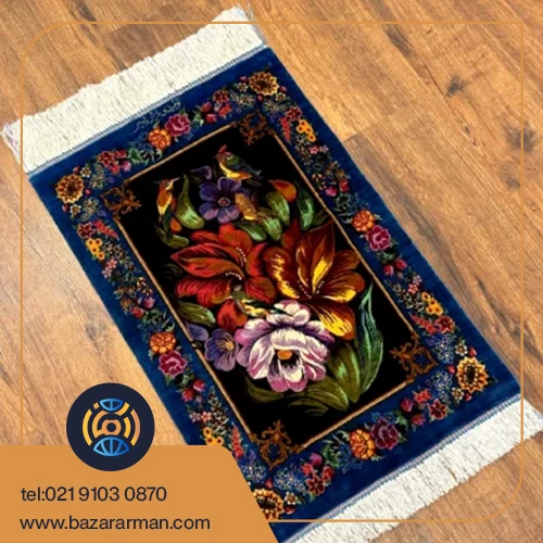 فرش ۴۵ در ۶۵ مشکی آبی طرح گل و مرغ