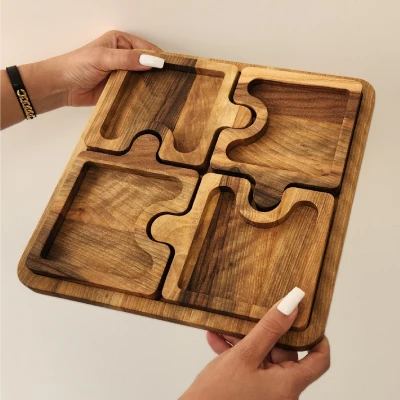 اردو خوری پازلی چهار تکه محصولی از شرکت آمود که برای مصارف پذیرایی و سرو انواع  اغذیه، طراحی و ساخته شده. این محصول از جنس چوب گردو بوده و دقت زیادی در انتخاب متریال آن بکار رفته شده است. این محصول علاوه بر زیبایی منحصر بفرد خود، به شما  این امکان را میدهد که انواع وسایل پذیرایی مثل آجیل،خشکبار،شکلات و مواردی از این قبیل را به صورت متنوع در کنار هم، برای مهمانان ویژه خود سرو کنید.از این محصول میتوان حتی برای سرو انواع پیش غذا بر روی میز ناهار خوری استفاده کرد.